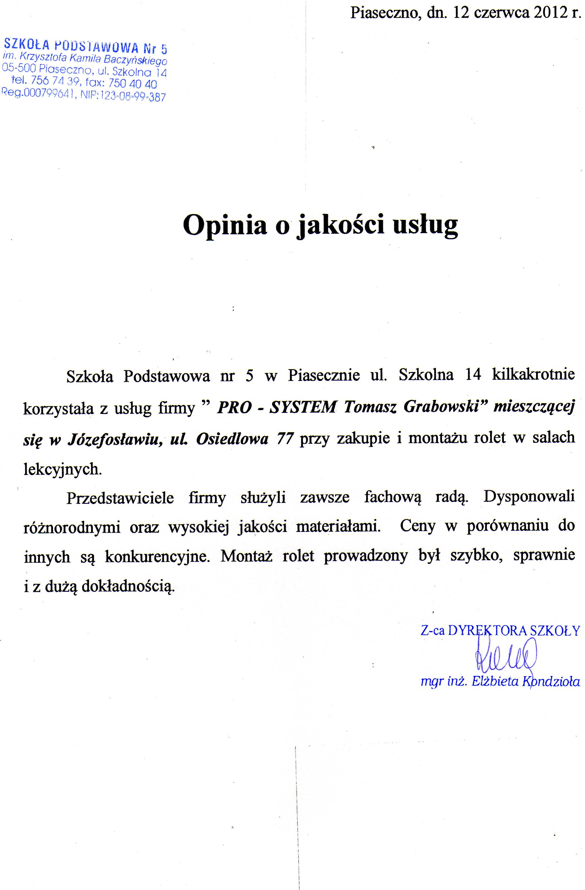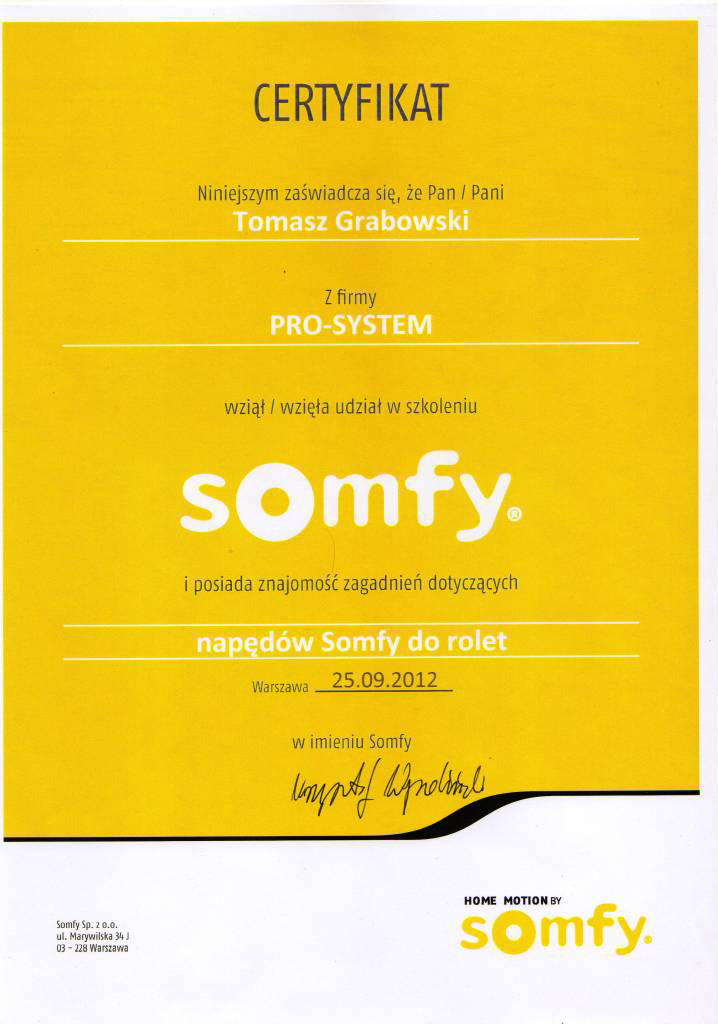 PRO-SYSTEM, referencje Poniżej zamieszczamy teksty niektórych listów referencyjnych, otrzymanych od Naszych Zleceniodawców. LABORATOIRES BOIRON PIRELLI PEKAO REAL ESTATE TARBONUS JUL & PARTNERS CERTYFIKAT SOMFY – TOMASZ GRABOWSKI CERTYFIKAT SOMFY – JAROSŁAW DĄBKOWSKI SYNAPSIS SZKOŁA PODSTAWOWA NR 5 W PIASECZNIE CMP